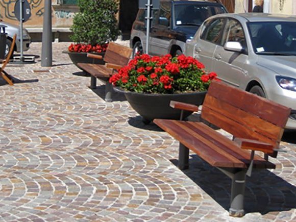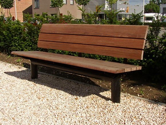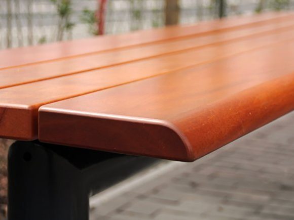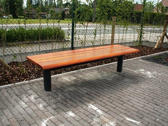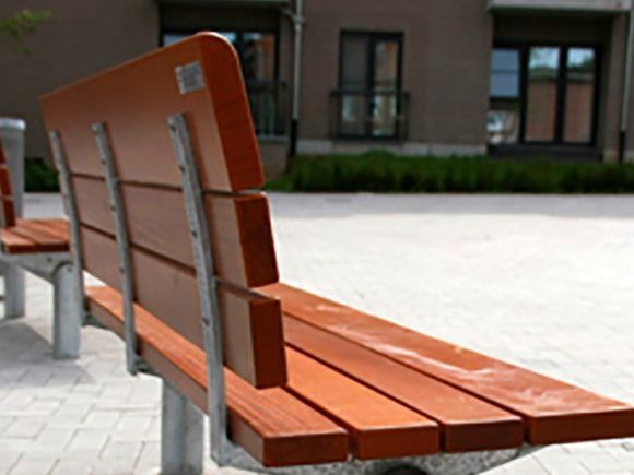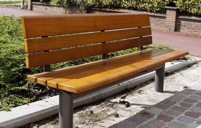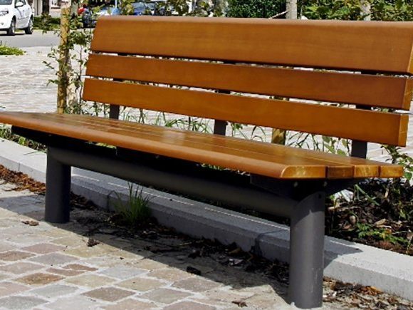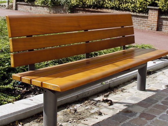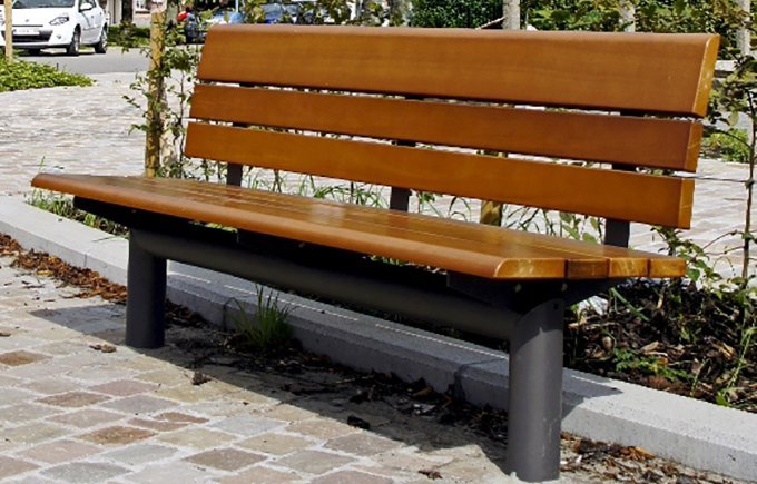 Au premier regard, le banc offre quelque chose de rassurant par ses formes classiques. Une impression confirmée par sa solidité : les lattes en bois exotique de l’assise sont fixées sur un châssis en tube d’acier, lui-même arrimé à des piétements en acier mécano-soudé. L’assise au bord arrondi et le dossier incurvé accueillent le passant dans un grand confort, d’autant que des accoudoirs sont prévus en option.