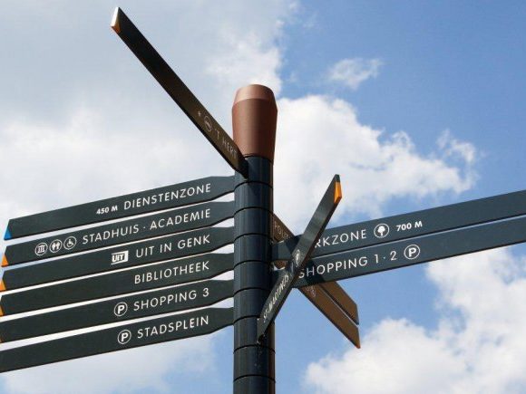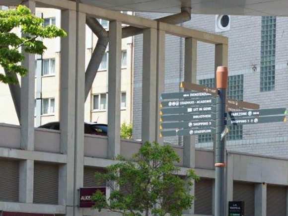 Le mât en acier est galvanisé et laqué par poudrage polyester. Toutes les pièces en aluminium sont laquées par poudrage polyester. Le lettrage des flèches est réalisé par fraisage et ensuite rempli d’une résine colorée.