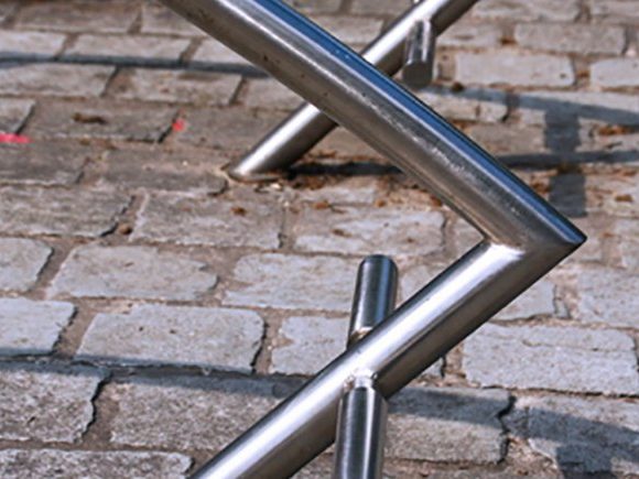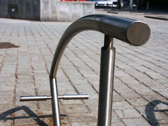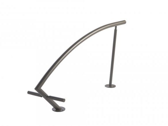 Le style très raffiné du support-vélos en fait un objet original qui n’en est pas moins etrêmement fonctionnel. Sur le profil tubulaire cintré en acier inoxydable, sont soudés deux tubes faisant office de piétement. Deux bicyclettes peuvent être rangées de part et d’autre du profil, les deux manchons placés horizontalement servant de butée aux roues avant.